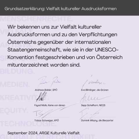 SPÖ, die Grünen, NEOS, KPÖ, Keine / Wandel und die Bierpartei unterzeichnen eine von der ARGE Kulturelle Vielfalt initiierte Erklärung und bekennen sich zu den Grundsätzen der UNESCO-Konvention „Vielfalt kultureller Ausdrucksformen“.