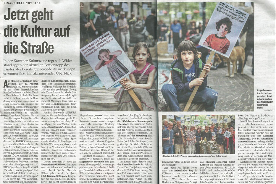 - Laut LR Benger seien 85% seines Budgets Ermessensausgaben. (Ob das zutrifft, werden wir noch recherchieren). Ein guter Teil davon ist aufgrund von vertraglichen Verpflichtungen gebunden (zB Carinthischer Sommer, Dreijahresverträge etc..), da kann kaum gekürzt werden, weshalb zu befürchten ist, dass der verbleibende kleinere „freie“ Teil aus dem wir gefördert werden überproportional zum Handkuss kommt.