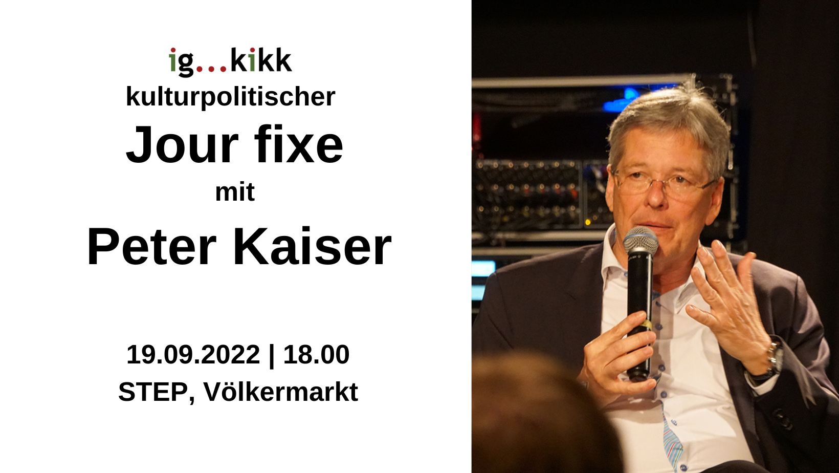 Die IG KiKK lädt jährlich zum Dialog mit dem Kulturreferenten des Landes. Ein halbes Jahr vor den Kärntner Landtagswahlen resümieren wir über die fast vierjährige Amtsperiode von Landeshauptmann und Kulturreferent Dr. Peter Kaiser am 19. September im STEP in Völkermarkt.