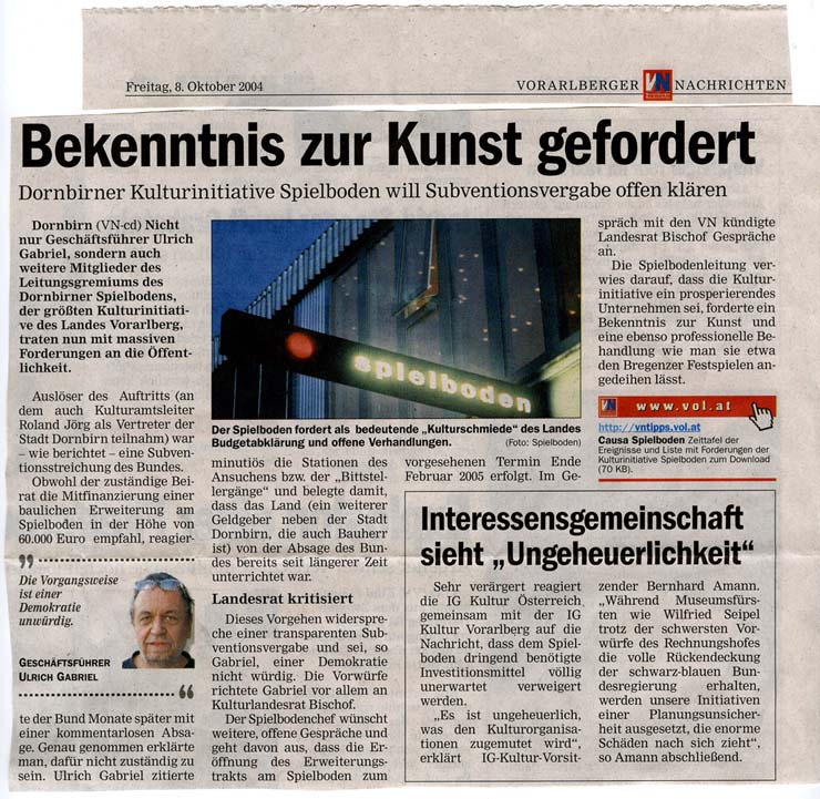 Zur Vorgeschichte: Bereits im Februar 2004 wurden seitens des Beirats der Abteilung II/8 der Kunstsektion im Bundeskanzleramt einmalig 60.000 Euro zur Förderung empfohlen, damit auch der Bund neben Land und Gemeinde für notwendige Baumaßnahmen seinen Beitrag leistet. Zugleich wurde dem SPIELBODEN von Kulturlandesrat Bischof die volle Unterstützung zugesichert, dass auch die Vorarlberger Landesregierung sich für eine rasche Abwicklung dieser Förderung bei Staatssekretär Morak einsetzen werde. Am 27. September 2004 erhielt das Kulturzentrum eine plötzliche Absage mit der lapidaren Begründung der Unzuständigkeit.