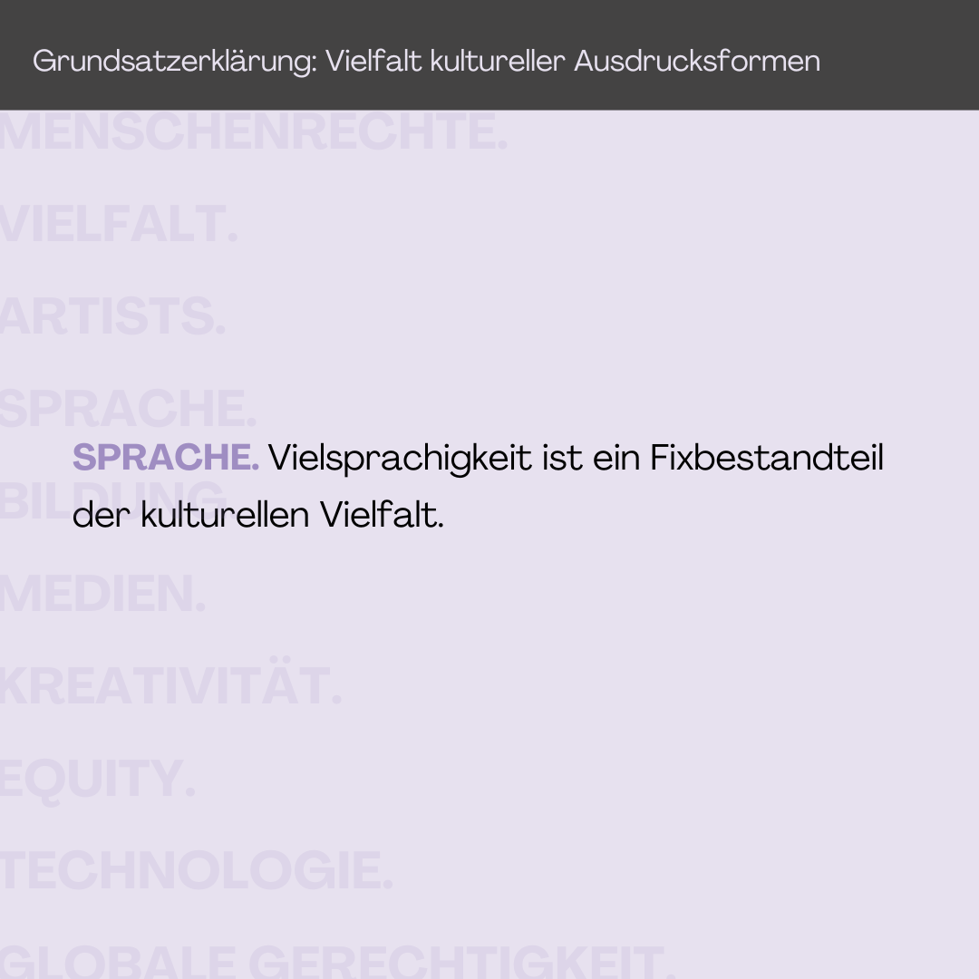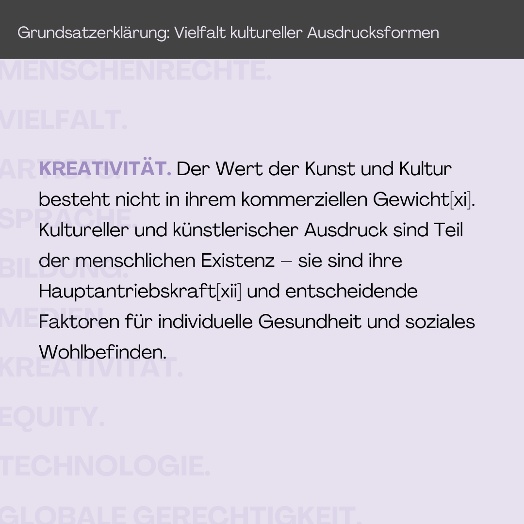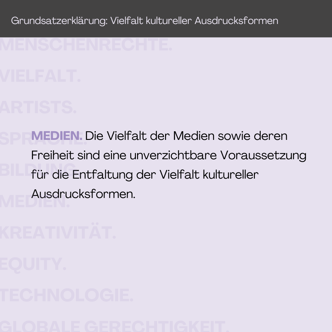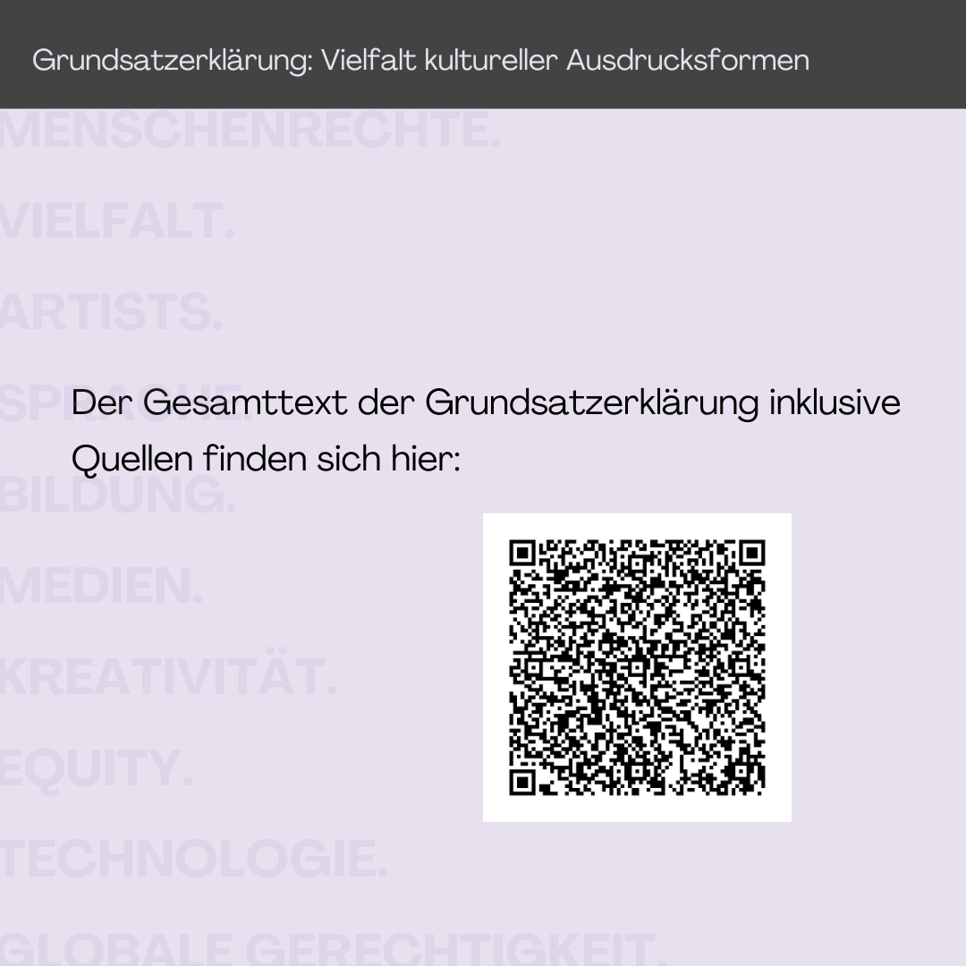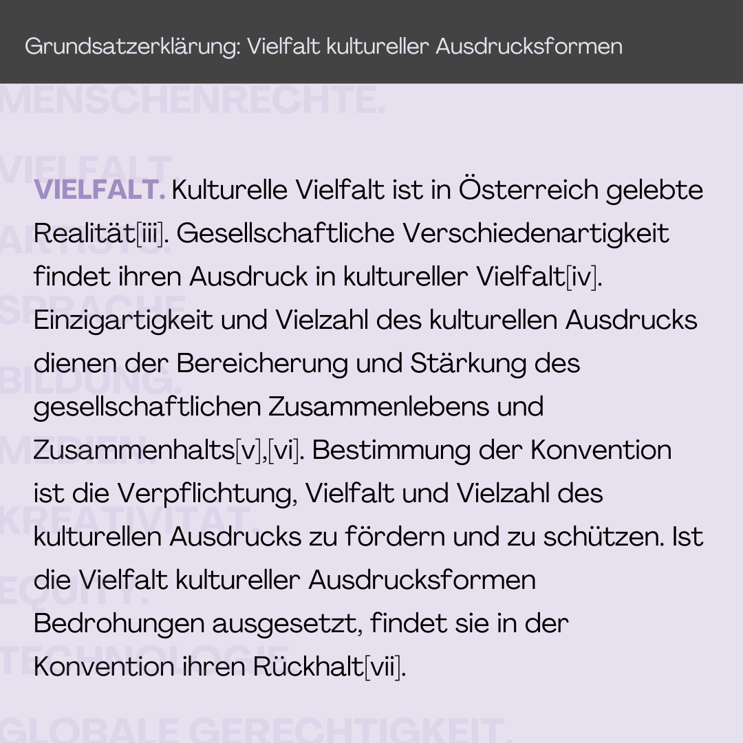 Die 10 Grundsätze der Erklärung heben den Stellenwert und die Bedeutung der UNESCO-Konvention für Österreich hervor. Grundlage jeder Kulturpolitik im Sinne der UNESCO-Konvention ist die Achtung der Menschenrechte und Grundfreiheiten.
