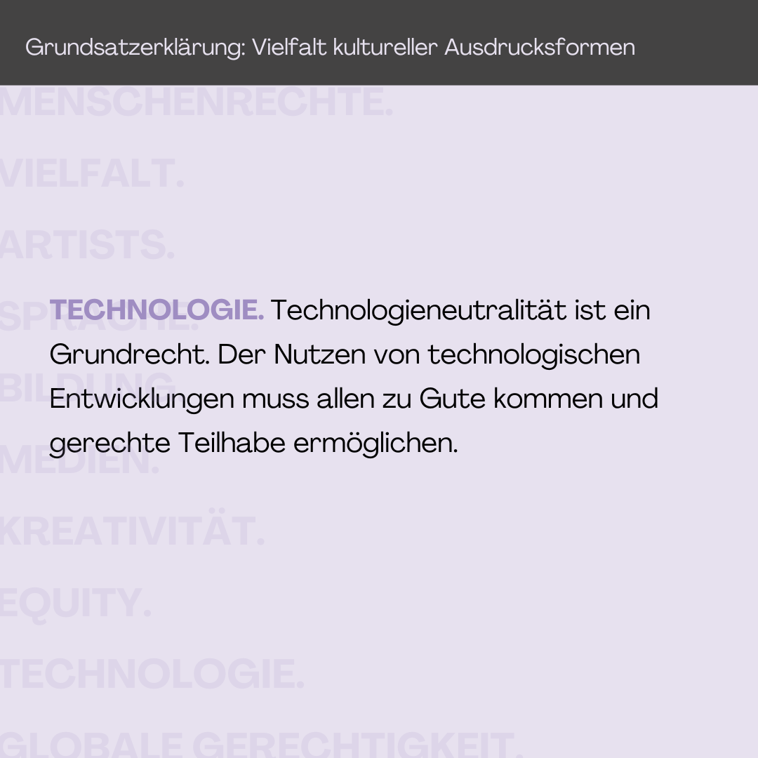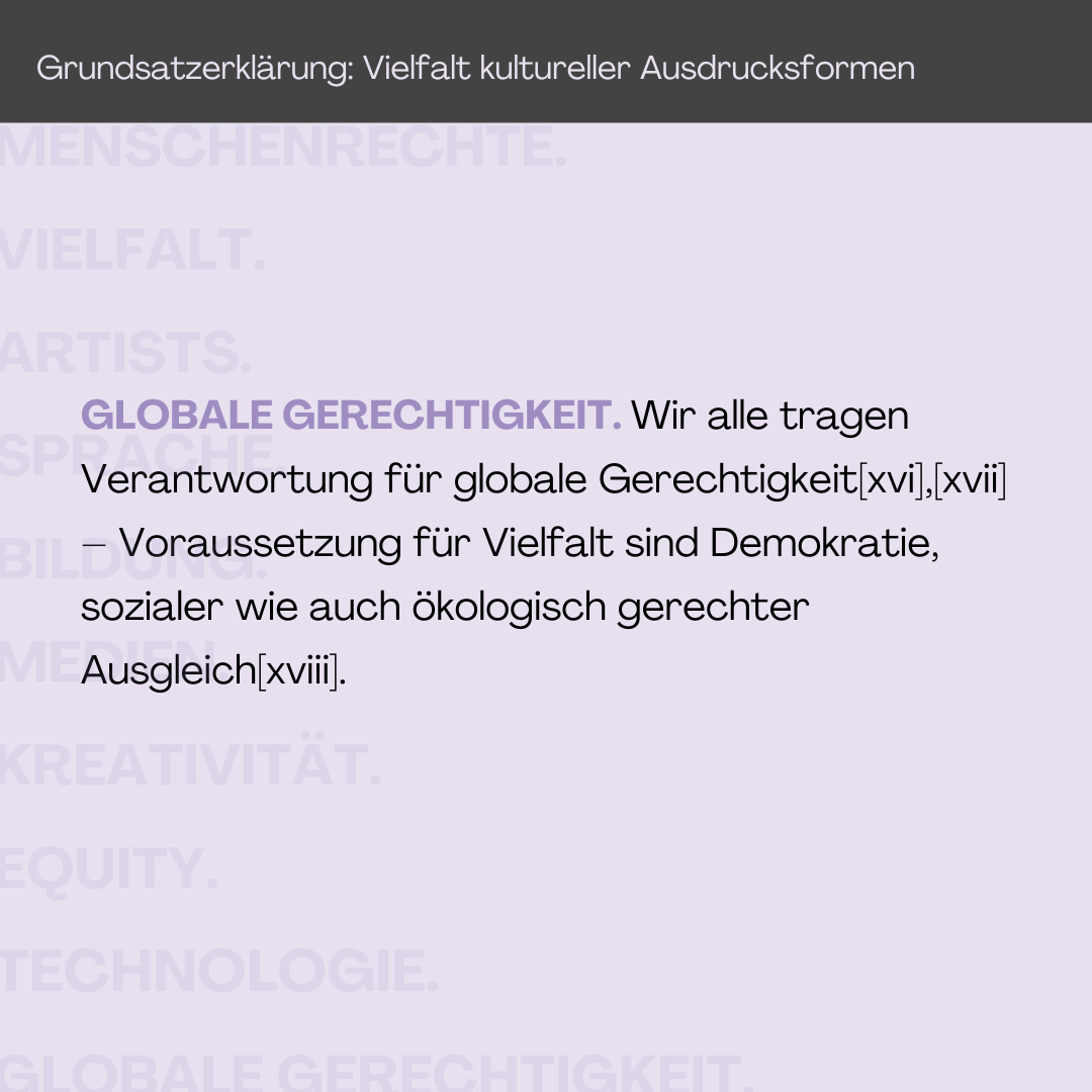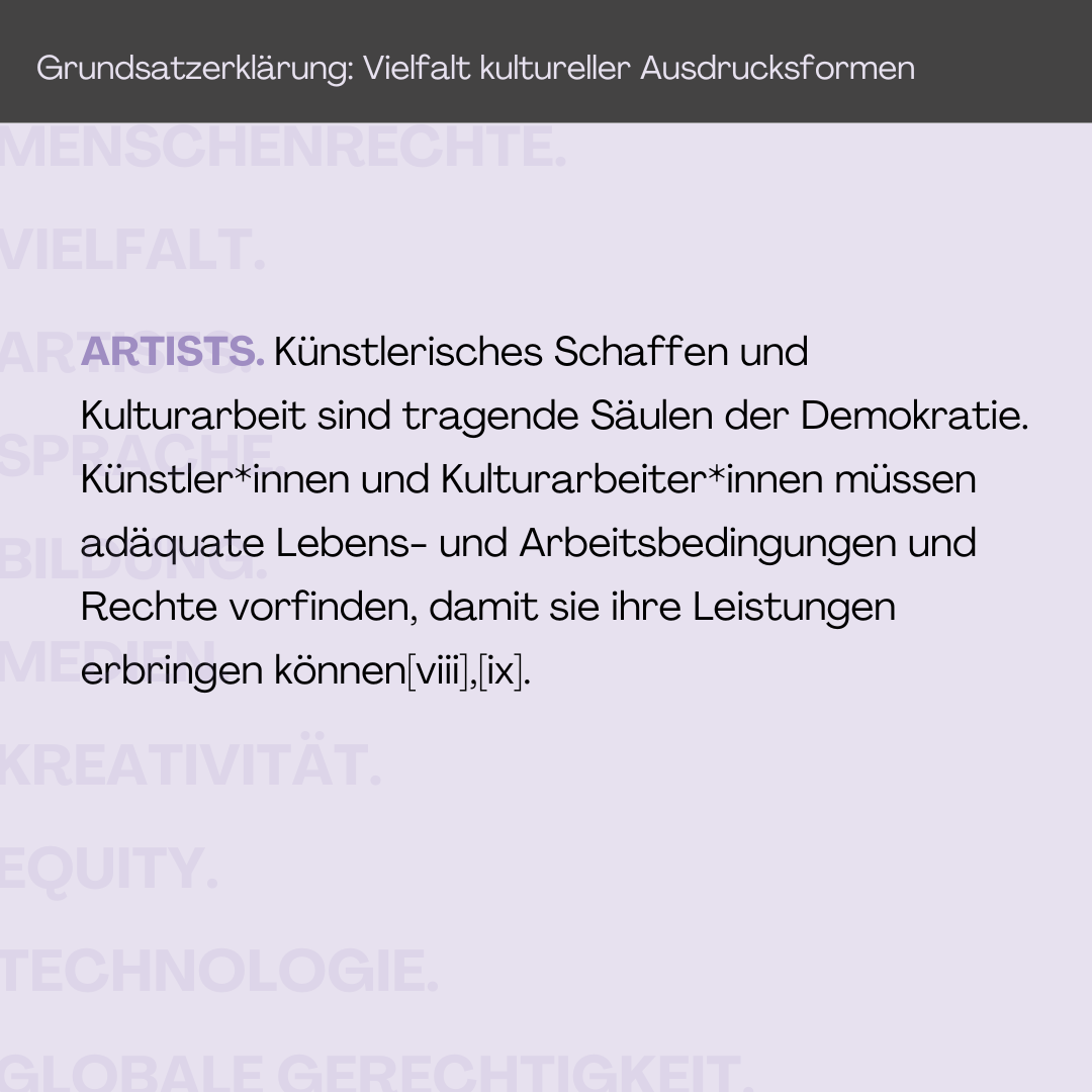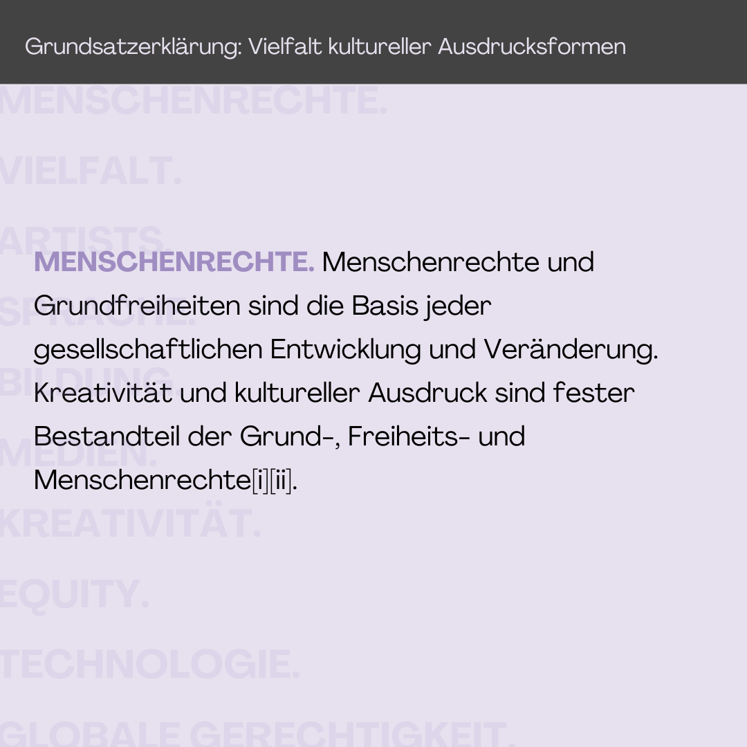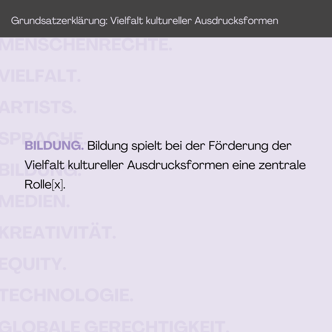 Die 10 Grundsätze der Erklärung heben den Stellenwert und die Bedeutung der UNESCO-Konvention für Österreich hervor. Grundlage jeder Kulturpolitik im Sinne der UNESCO-Konvention ist die Achtung der Menschenrechte und Grundfreiheiten.