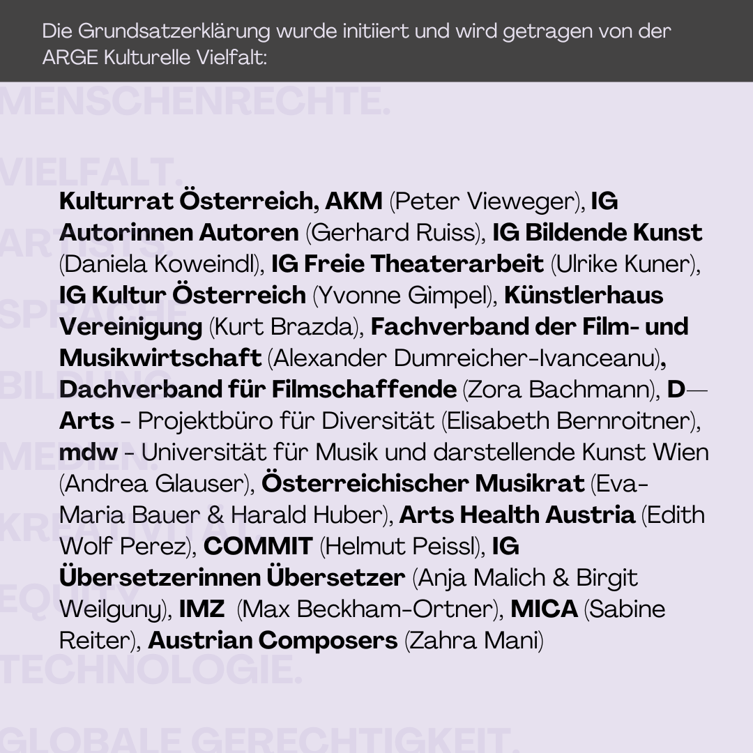 Die Grundsatzerklärung wurde initiiert und wird getragen von der ARGE Kulturelle Vielfalt. Die ARGE ist das international anerkannte Good-Practice Beispiel, wie Kulturpolitik nachhaltig in Partnerschaft mit der Zivilgesellschaft gestaltet werden kann.