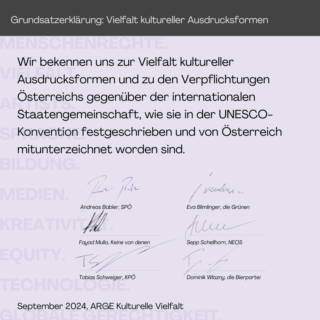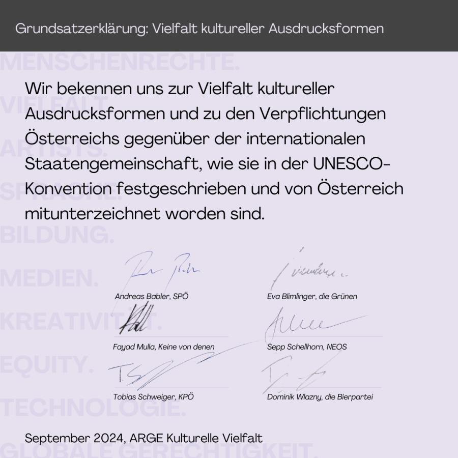 Die ARGE Kulturelle Vielfalt hat alle Spitzenkandidat*innen der wahlwerbenden Parteien eingeladen, die Grundsatzerklärung "Vielfalt kultureller Ausdrucksformen" zu unterzeichnen. Sechs Parteien sind dieser Einladung nachgekommen und haben ein klares Zeichen für die Vielfalt kultureller Ausdrucksformen gesetzt: Andreas Babler (SPÖ), Eva Blimlinger (die Grünen), Fayad Mullah (Keine von denen), Sepp Schellhorn (NEOS), Tobias Schweiger (KPÖ) und Dominik Wlazny (die Bierpartei) (alphabetisch gereiht entsprechend Nachname). Mit der Unterzeichnung der Grundsatzerklärung bringen die wahlwerbenden Parteien ihre Unterstützung für die Einhaltung der in der UNESCO-Konvention dargelegten Prinzipien klar zum Ausdruck.