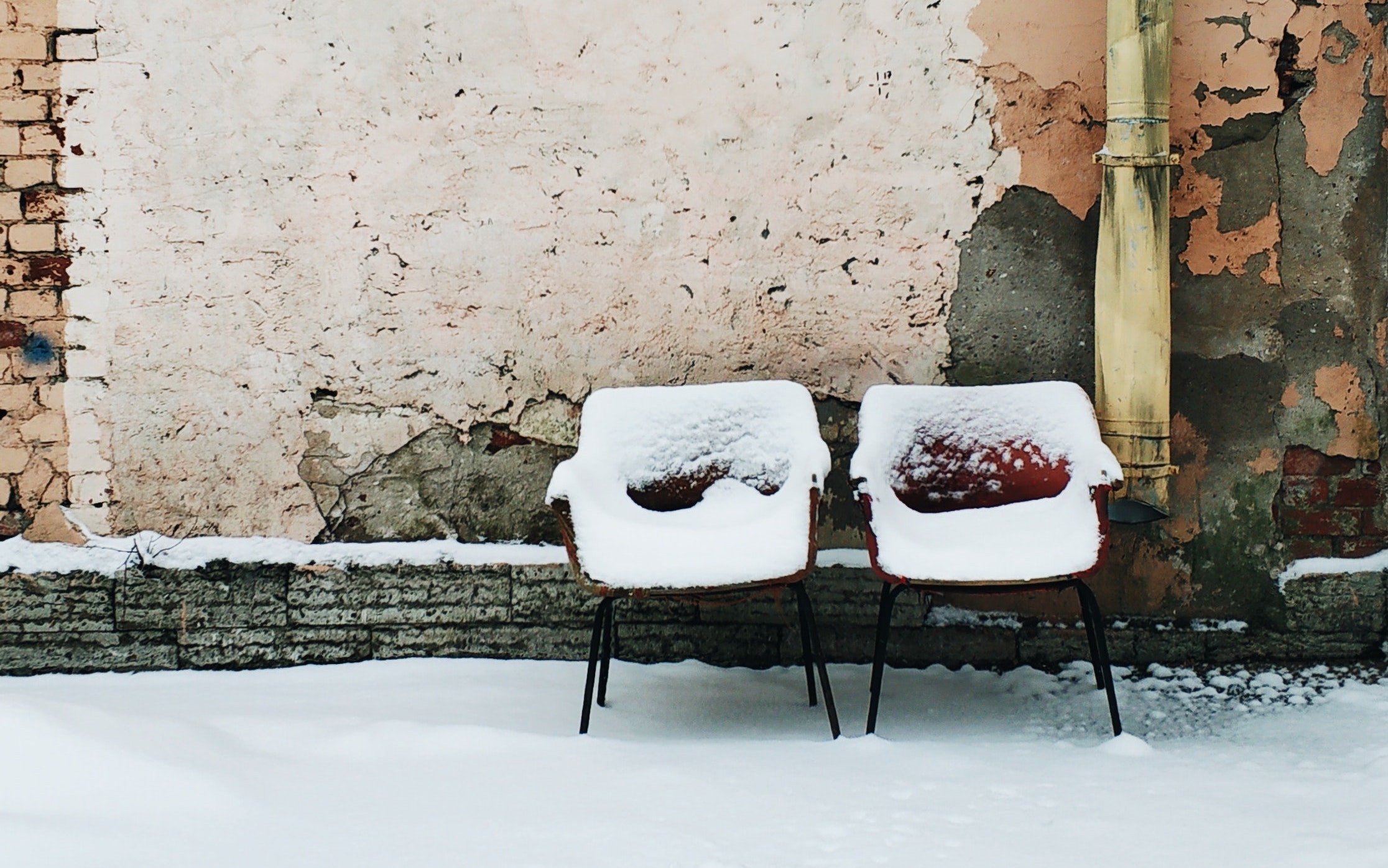 zwei rote Sessel mit Schnee bedeckt