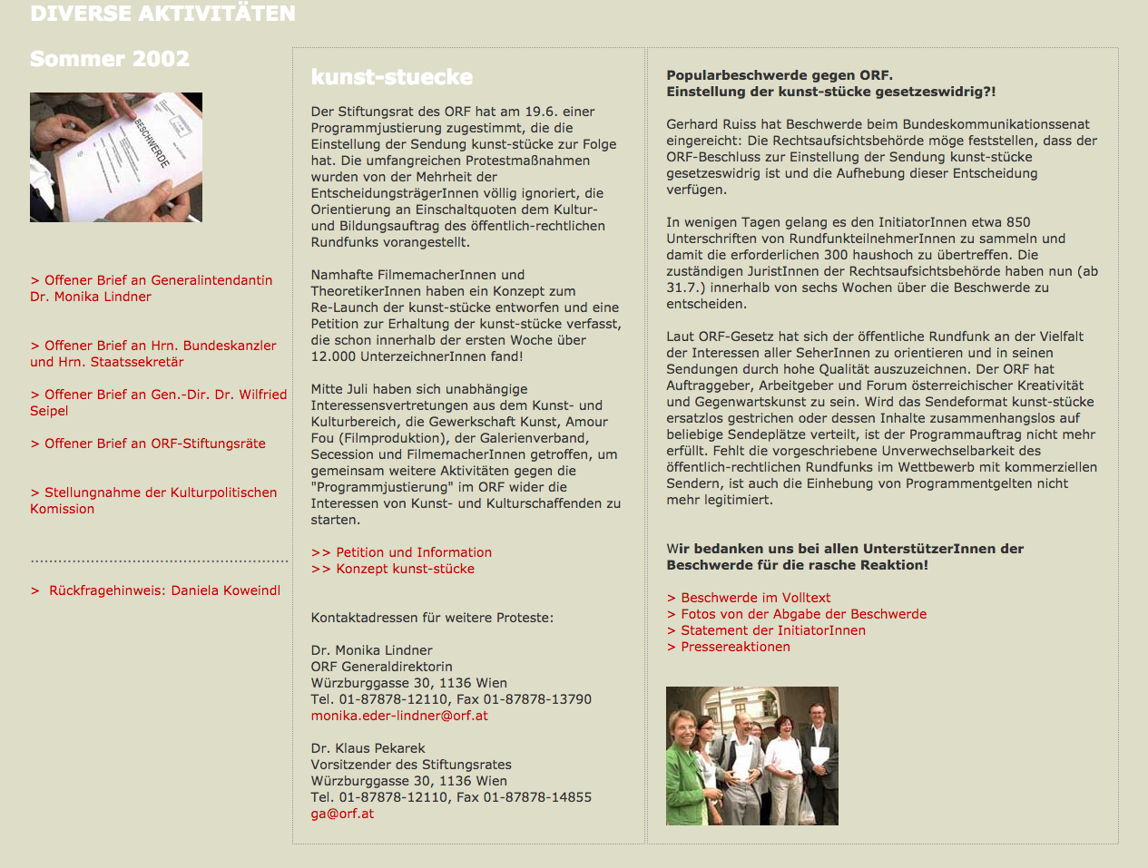Laut ORF-Gesetz hat sich der öffentliche Rundfunk an der Vielfalt der Interessen aller SeherInnen zu orientieren und in seinen Sendungen durch hohe Qualität auszuzeichnen. Der ORF hat Auftraggeber, Arbeitgeber und Forum österreichischer Kreativität und Gegenwartskunst zu sein. Wird das Sendeformat kunst-stücke ersatzlos gestrichen oder dessen Inhalte zusammenhangslos auf beliebige Sendeplätze verteilt, ist der Programmauftrag nicht mehr erfüllt. Fehlt die vorgeschriebene Unverwechselbarkeit des öffentlich-rechtlichen Rundfunks im Wettbewerb mit kommerziellen Sendern, ist auch die Einhebung von Programmentgelten nicht mehr legitimiert.