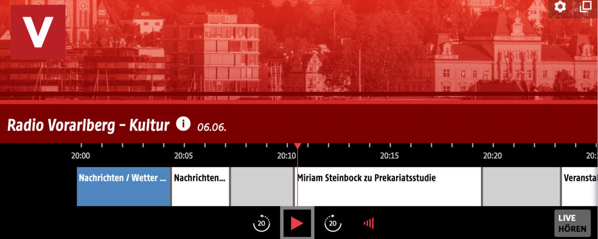 Ende Mai wurde die Prekariatsstudie veröffentlicht, eine Untersuchung der FH Vorarlberg im Auftrag der Vorarlberger Landesregierung zu den Lebens- und Einkommensverhältnissen Kunstschaffender. Das Ergebnis ist so erschreckend wie erwartet: Jede*r zweite Künstler*in in Vorarlberg ist armutsgefährdet. Die Handlungsempfehlungen der Studienautor*innen, basierend auf umfassenden Erhebungsmaterial und Vorschlägen aus der Szene, bieten konkrete To Dos, denn nach der Studie ist vor der Strategie! Nun sind die politischen Entscheidungsträger*innen am Zug und könnten gemäß Regierungsprogramm entsprechende Förderungs- und Budgetschritte setzen. Annette Raschner vom ORF Vorarlberg führte dazu ein Interview mit Mirjam Steinbock, Geschäftsführerin der IG Kultur Vorarlberg.