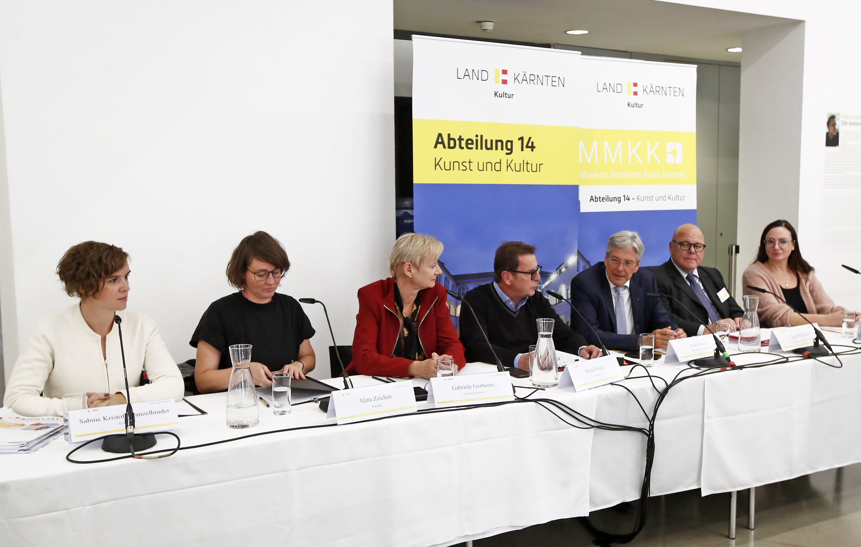 Podiumsdiskussion zum Thema „Fair Pay und Fairness“ mit Landeshauptmann und Kulturreferent Dr. Peter Kaiser, A.bteilungsleiter Mag. Igor Pucker, Sachgebietsleiterin Dr.in Anna Wöllik, Mag.a (FH) Mag.a Alina Zeichen (IG KIKK), Sabine Kristof-Kranzelbinder (IG TTPKK) und Mag.a Gabriele Gerbasits (IG Kultur Österreich) im Foyer des MMKK, Burggasse 8, 1. Stock