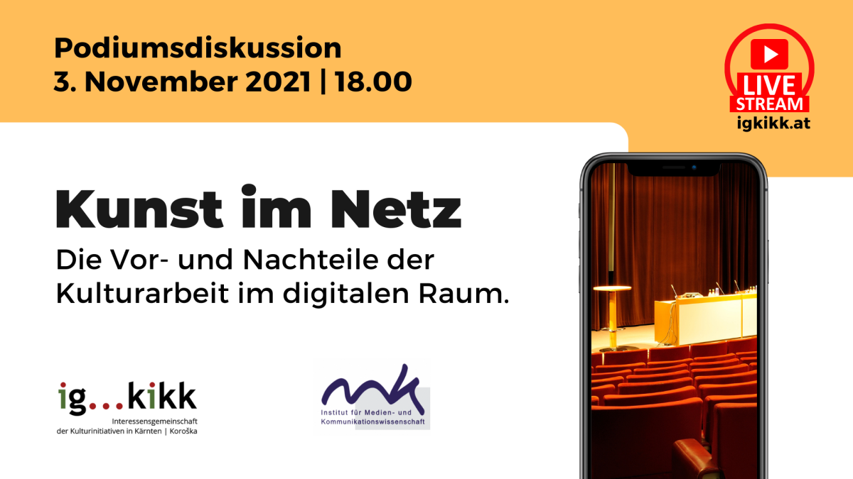 Ausgehend von der Podiumsdiskussion „Kunst im Netz“, die am 3. November um 18.00 auf der Alpen-Adria Universität Klagenfurt sowie per Live-Stream über die IG KiKK-Webseite stattfindet, beschäftigt sich die zweite Episode mit dem Thema Kulturinitiativen im digitalen Raum. Die Pandemie hat die Digitalisierung in allen Bereichen erzwungenermaßen vorangetrieben. Im Kultursektor bot sich der digitale Raum als Alternative an, doch inhaltliche und künstlerische Vorbehalte sowie technische Anforderungen schreckten viele Kulturtätige davon ab, diesen Weg zu gehen. In der Radiosendung sollen die Chancen sowie Herausforderungen für die Umsetzung digitaler Kulturprojekte beleuchtet werden.