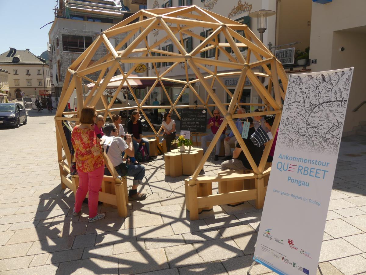 Besonders beliebt in beiden Regionen sind die sogenannten Kuppelgespräche: Eine wunderbare Holzkuppel, in Kooperation mit european public sphere, bringt dabei die Anliegen der Gemeinden unter ein schützendes Dach. Hier diskutieren Gemeindemitglieder beispielsweise mit Landesrätin Klambauer oder Georg Pfeifer, Leiter des Verbindungsbüros des EU-Parlaments in Wien, über den Wert der EU für die Regionen. Dialog heißt natürlich, dass jede Meinung zählt und gehört wird, also kommen hier auch Menschen ohne Amt und Würden zu Wort – anregend, vielseitig, konfrontativ.