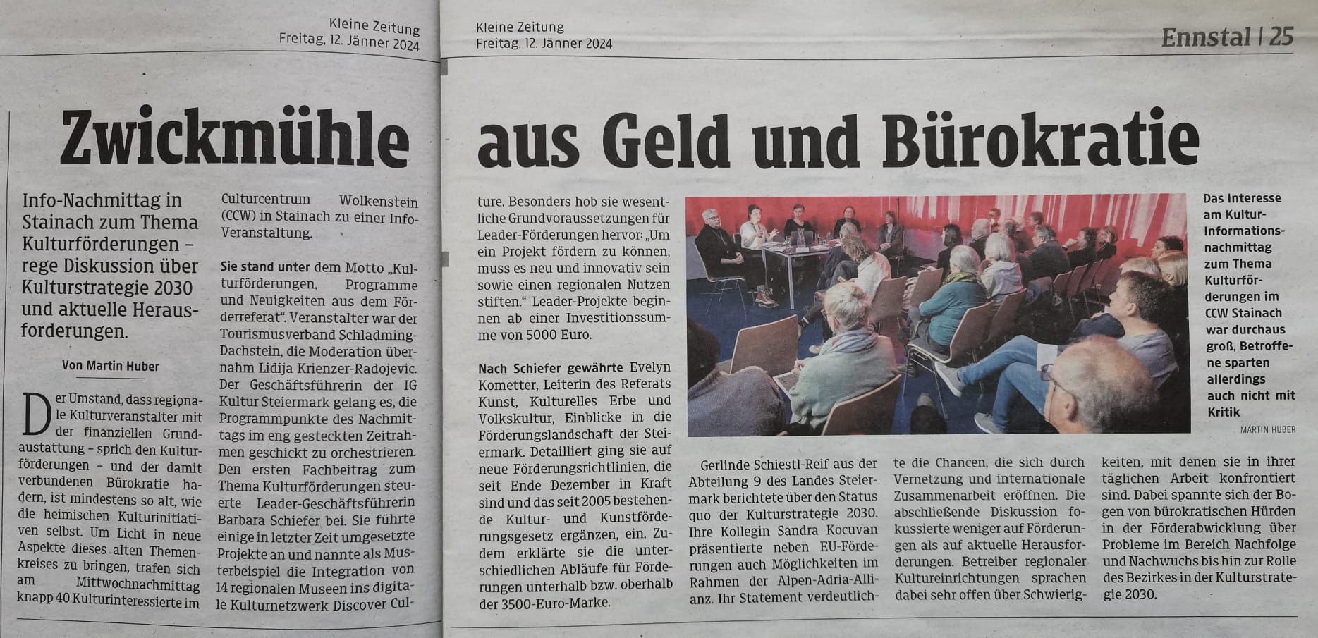 Die Abteilung 9 Kultur, Europa, Sport des Landes Steiermark hat in Kooperation mit dem Tourismusverband Schladming-Dachstein und der IG Kultur Steiermark am 10. Jänner 2024 zur Informationsveranstaltung Kulturförderungen im CCW Stainach eingeladen. Hier findet ihr alles zum Nachlesen.